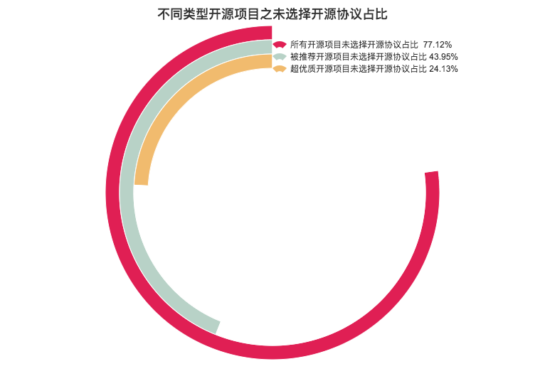 在参与统计的 144 个 Top 开源项目中,未选择开源协议的项目占到了 24.31%;在码云推荐过的 7000 多个开源项目中,未选择开源协议的占比 43.95% ;而在码云上所有的开源项目中,这一数据扩大到了 77.12% 。