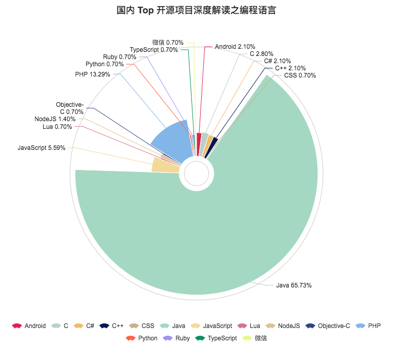 Java 类编程语言在 Top 开源项目中可以说遥遥领先,占到 65.73%。包括了 guns、nutz、jeecg 等优质的开源项目,此类框架式的项目受到了众多开发者的喜爱。