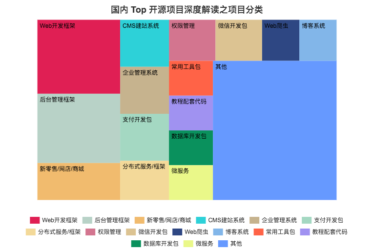 从上图中我们可以看到 Web开发框架、后台管理框架、新零售/网店/商城、企业管理系统、支付开发包占据了较大的比例,这也表明了目前市场的业务需求现状。微信开发包、越来越火的微服务也进入了前 15 名,只要你的项目解决了某一个领域的实际问题,都能够得到开发者们的认可。