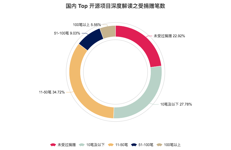 除去有约 23% 的开源项目未接受过任何捐赠(可能主要因为作者未开通捐赠功能),大部分开源项目都收到了广大开发者的“打赏”支持,其中最多的分布在 11-50 笔捐赠中,占比约 35%。