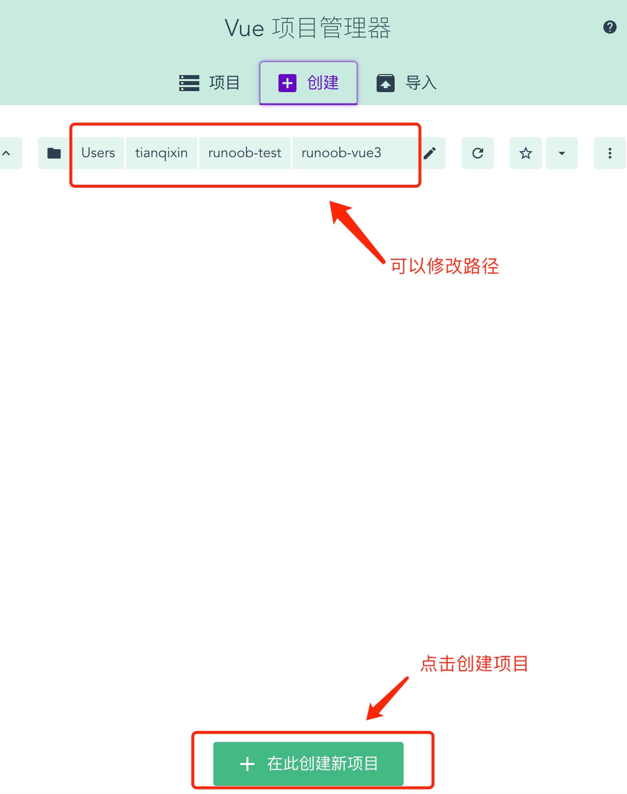 我们可以点击"创建"选项来创建一个项目,选择底部"在此创建项目",页面上方也可以选择路径:
